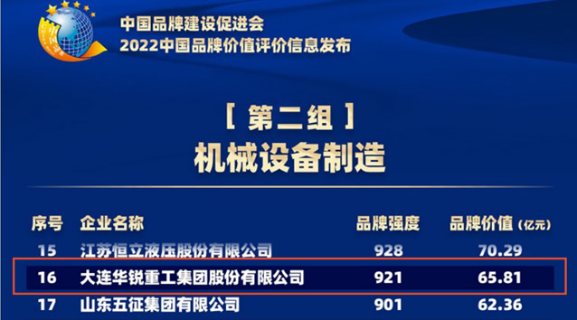 9月5日,中國(guó)品牌建設(shè)促進(jìn)會(huì)、中國(guó)資產(chǎn)評(píng)估協(xié)會(huì)、新華社民族品牌工程辦公室等單位在京聯(lián)合發(fā)布了“2022中國(guó)品牌價(jià)值評(píng)價(jià)信息”。榜單顯示,大連重工的品牌價(jià)值評(píng)估結(jié)果為65.81億元,品牌強(qiáng)度921分,是遼寧省機(jī)械設(shè)備制造類唯一上榜企業(yè),位列中國(guó)機(jī)械設(shè)備制造類企業(yè)第16位。