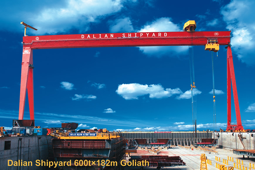 造船門式起重機(jī)是一種大起重量、大跨度,多功能、高效率的門式起重機(jī),專用于船塢或船臺進(jìn)行大型船體分段、對接及翻轉(zhuǎn)作業(yè)。 大連重工自1999年研制出全變頻調(diào)速造船門式起重機(jī)以來,積累了豐富的機(jī)電設(shè)計(jì)、結(jié)構(gòu)分析計(jì)算、制造、運(yùn)輸、安裝和調(diào)試經(jīng)驗(yàn),形成了自主的核心技術(shù),至今已研制了200—800噸等不同規(guī)格的造船門式起重機(jī)。